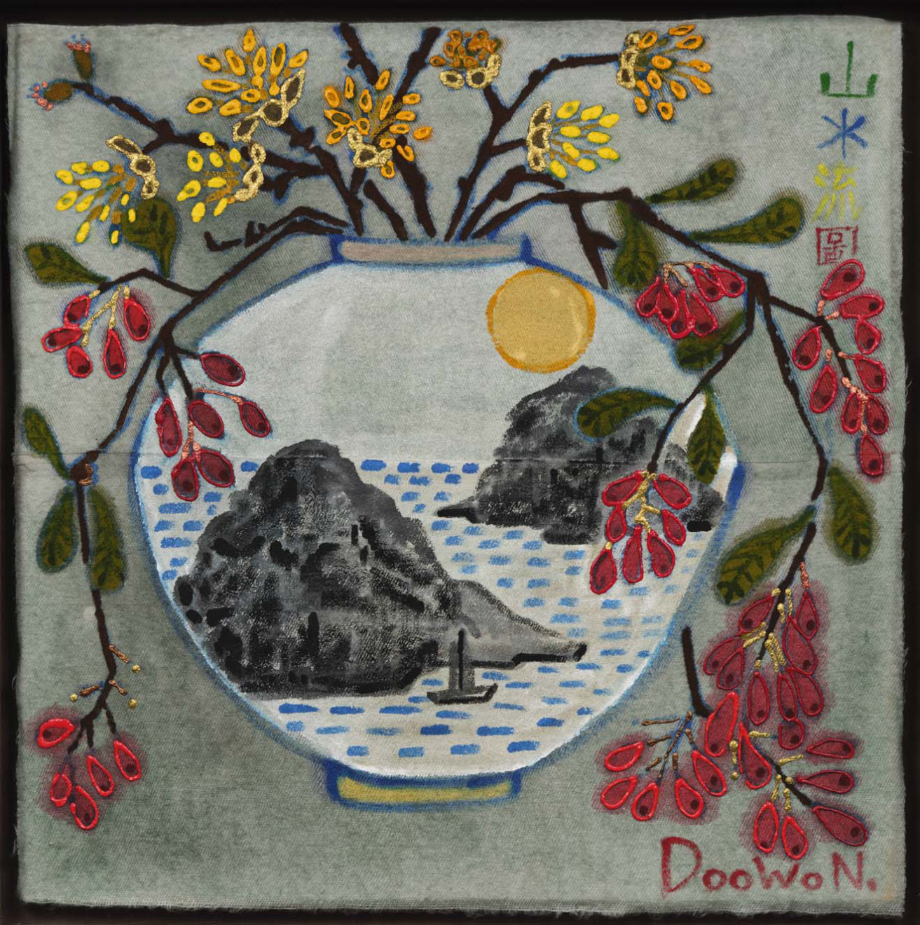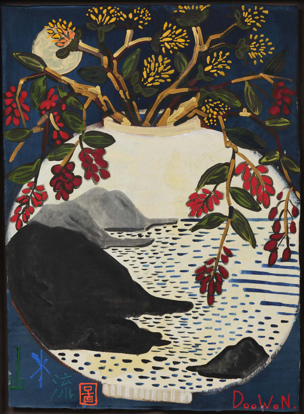 - Doowon’s Sansuyu Painting in Moon Jar (Sansuyu: Cornelian cherry blossom/fruit; also a homonym for “mountains and flowing water” in Korean), 2025