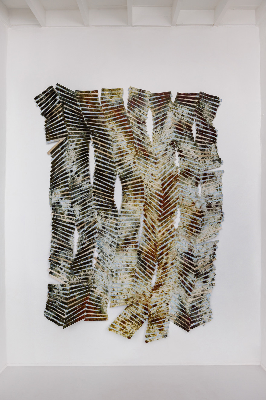 - hand—dyed cotton (reactive dyes), repurposed damask, other assorted textiles, velcro on wooden mount